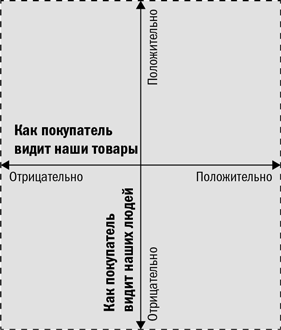 Простой способ, позволяющий отслеживать, как покупатели воспринимают продавцов, – попросить руководителей отдела продаж оценить, как важные покупатели судят о компании и ее действиях. Результаты можно нанести на прямую, на одном конце которой разместить отрицательные оценки, а на другом – положительные. Если требуется более подробная оценка, компания-продавец может поместить на две перпендикулярные друг другу оси свои продукты и продавцов, как на следующем рисунке.