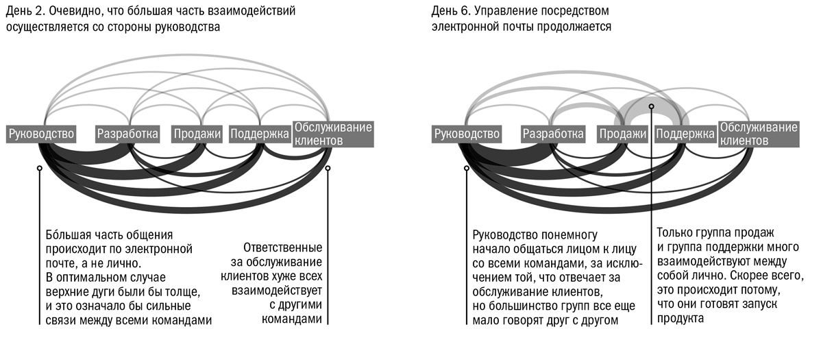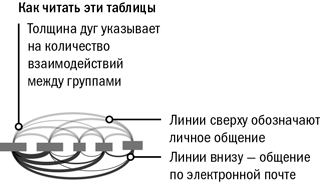 Схемы поиска отражают принципы взаимодействия внутри организаций. К примеру, они могут показывать, поддерживает ли руководство отдела связь со всеми группами подчиненных. Долговременное наблюдение за контактированием и поиском команд покажет, способны ли они эффективно переключаться между этими двумя видами деятельности. Диаграммы можно сделать более детальными, например выделить разные виды взаимодействия между членами команды, чтобы узнать, не следуют ли они непродуктивным схемам общения, скажем, не обмениваются ли электронными письмами, тогда как им лучше чаще контактировать лично. (Пример подобной таблицы см. на врезке «Схематическое изображение взаимодействия с течением времени».)