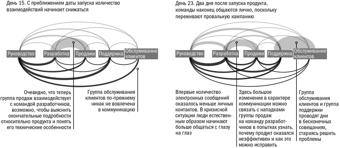 Схемы являются собственностью компании Sociometric Solutions.Схематическое изображение взаимодействия с течением времениПриведенные ниже схемы показывают образцы взаимодействия в отделе маркетинга одного немецкого банка. Наблюдения проводились непосредственно перед запуском нового крупного продукта и сразу же после него. В отделе было по одной команде каждого вида: обслуживание клиентов, продажи, поддержка, разработка и руководство. Все группы состояли из четырех человек. Помимо сбора данных по персональному взаимодействию с помощью социометрических карт, мы проанализировали электронную почту, чтобы определить соотношение между высокоценным личным общением и перепиской, имеющей более низкую ценность.