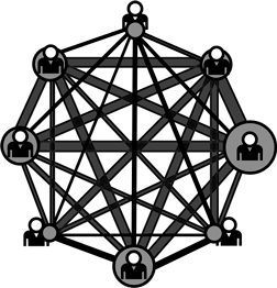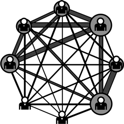 Схема показывает, что все контактирование команды прочно завязано на тех же самых трех людях (А, В и С). G пытается достучаться до тех, кто принимает решения, но «команда внутри команды» находится там, где высокое контактирование. Возможно, А, В и С занимают более высокий уровень или просто более общительны, но это не имеет значения. Схема указывает на более низкие показатели, потому что команда не получает новых идей или информации от большинства своих членов. Лидеры могут использовать эту диаграмму, чтобы задействовать «невидимых» членов команды (то есть задаться вопросами: «Как сильнее вовлечь их в общую работу? И подходят ли они, чтобы участвовать в этом проекте?») и чтобы сыграть роль харизматического связующего звена: собрать вместе людей, чтобы они поговорили друг с другом, помочь отверженным членам группы поделиться мыслями с остальными.