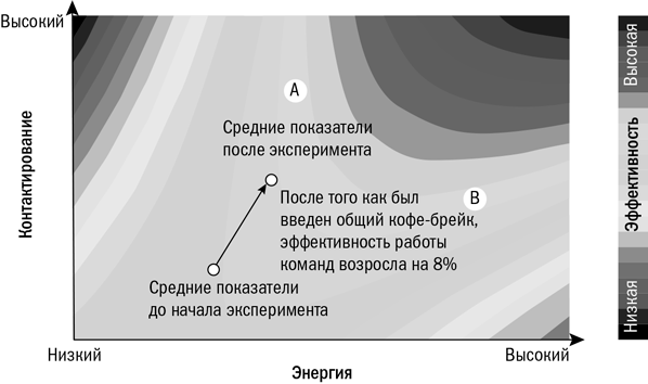 Руководитель хотел повышать энергию и контактирование синхронно. Мы предложили проводить для команд колл-центра общие кофе-брейки. Это повысило количество взаимодействий, особенно неофициальных, и у команд вырос уровень энергии. Также, поскольку все члены команды теперь уходили на перерыв одновременно и взаимодействия были равномерно распределены, улучшилось и контактирование. Когда мы позже сделали схемы энергии и контактирования в сопоставлении с СВО, результаты оказались предсказуемы: эффективность работы центра возросла в среднем на 8 %, а для групп, имевших ранее самые плохие показатели, – даже на 20 %.