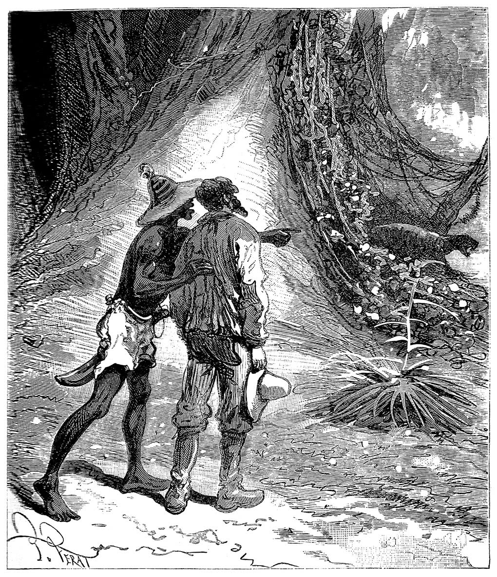 Робен вполголоса спросил у бони, в чем дело, и выяснил, что эти точки – горящие глаза ягуара, очевидно изголодавшегося, которого явно привлек запах копченой рыбы. Впрочем, хищник не проявлял никакой агрессии и нападать не собирался. Если судить по его мурлыканью, то можно было подумать, что он настроен вполне дружелюбно. Но все же это соседство встревожило Робена. Он схватил ружье бони и приготовился послать заряд свинца в нежданного гостя.