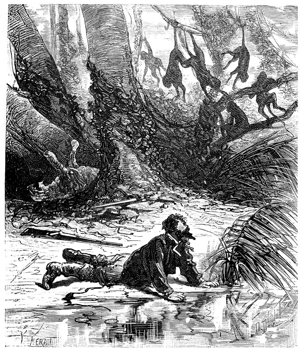 Превозмогая растущую слабость, беглец все же отыскал глазами несколько широких зелено-коричневых листьев обычной для Гвианы разновидности водяной лилии. Оставалось только срезать один из них, горизонтально погрузить его в воду и удерживать в нескольких сантиметрах от ее поверхности, что и было проделано без всякого труда.