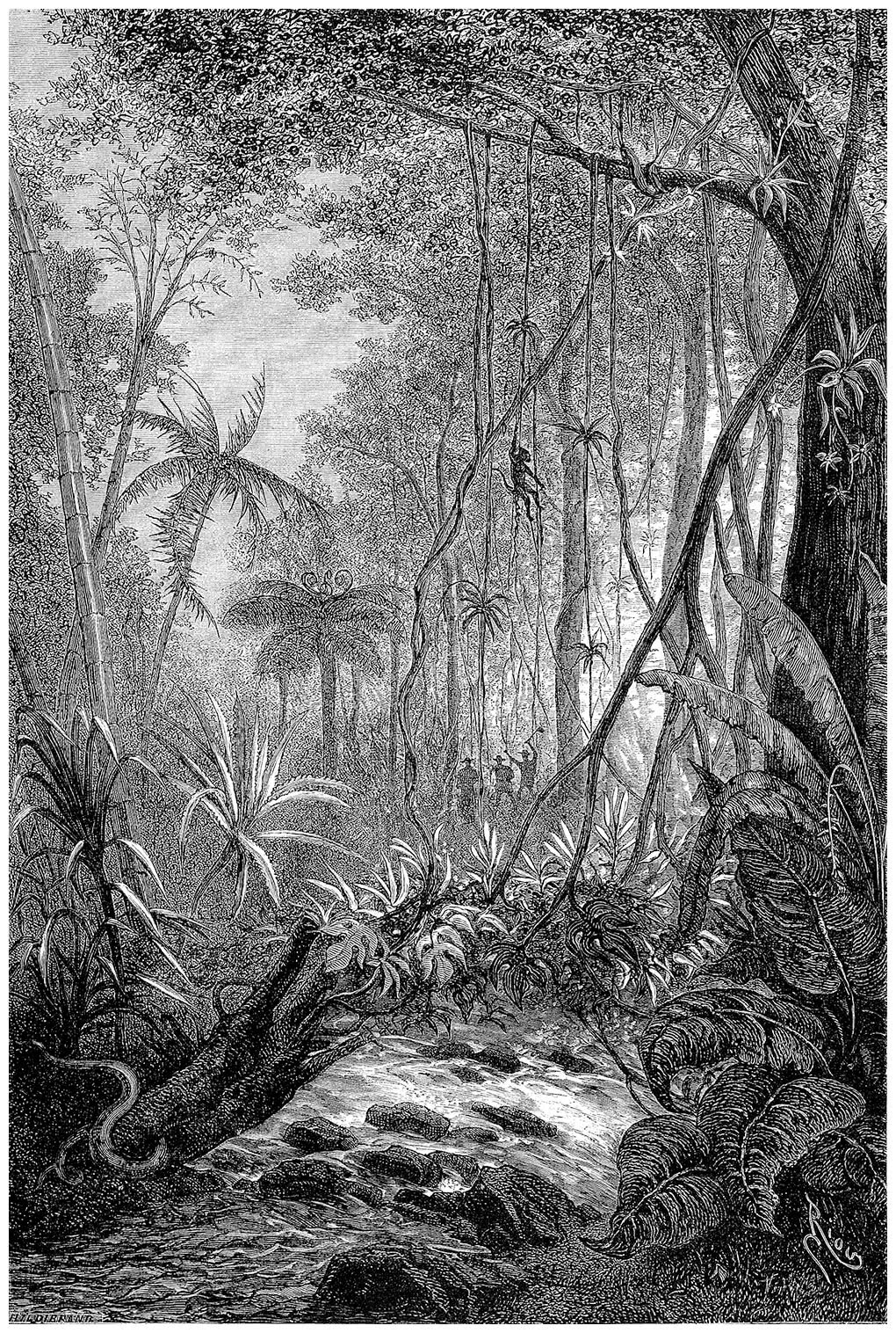 – Постой-ка! – тотчас воскликнул он. – Мне снится сон? Нет, это невозможно… Что это? Банановое дерево! А эта поляна… это же вырубка! Вон то густо посаженное растение с треугольными листьями, что стелется по земле, – это батат! А вот кокосы… ананас… калалу, маниок! О, как я хочу есть, просто умираю с голода. Так, значит, я в индейской деревне? Кто бы здесь ни жил, надо его найти, и будь что будет!