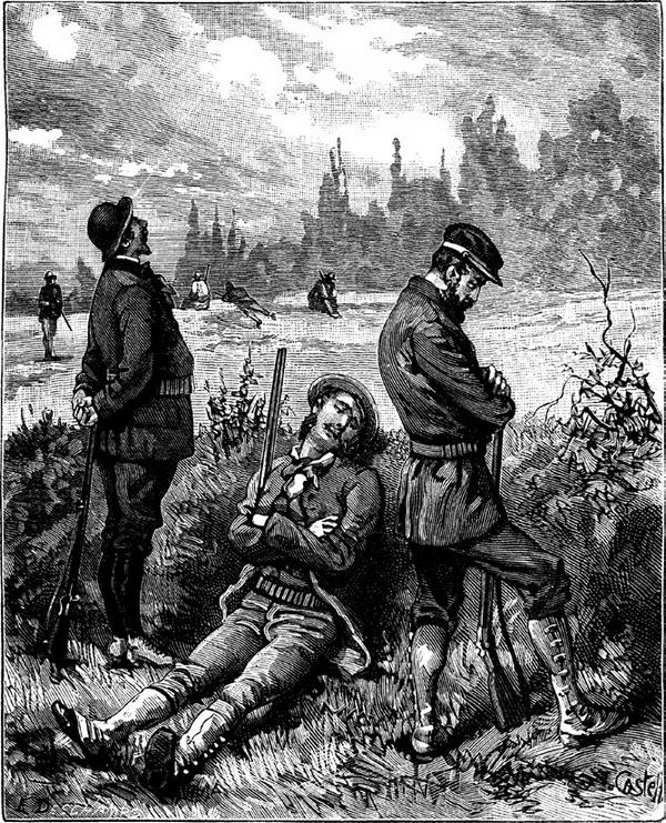 Но в семь часов утра, в походный час, все были снова в сборе в столовой, хотя и чувствовали себя невыспавшимися. Подан был легкий завтрак. Наскоро закусивши, восемь охотников весело рассыпались по равнине, каждый в сопровождении егеря, нагруженного запасными патронами.