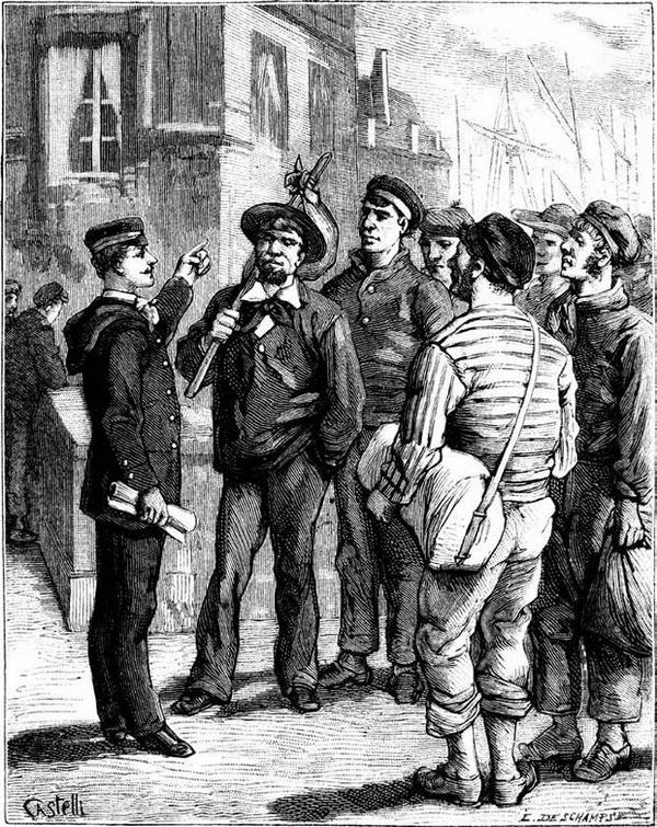 Фрике́ выполнил порученное ему дело очень удачно и в полном соответствии с указаниями. Он подобрал образцовый экипаж из бретонцев-матросов, которые были в восторге, что поедут на таком корабле, где не будет товаров, с погрузкой и выгрузкой которых приходится обыкновенно возиться. Фрике́ к назначенному дню привез их в Гавр и представил Андре Бреванну. Тот сейчас же допустил их на борт.