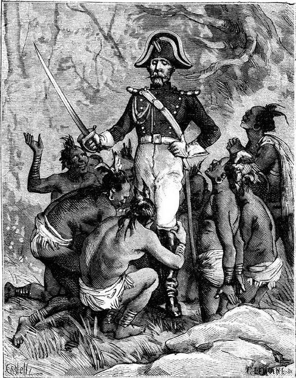 Итак, Барбантон выхватил саблю и объявил остолбеневшим дикарям о том, что в случае неповиновения разгонит «незаконное сборище» силой. Запнувшись обо что-то впопыхах, он упал, тотчас же вскочил и поднял свалившуюся с головы треуголку. Надевая ее опять, он сделал воинственный жест и повторил: