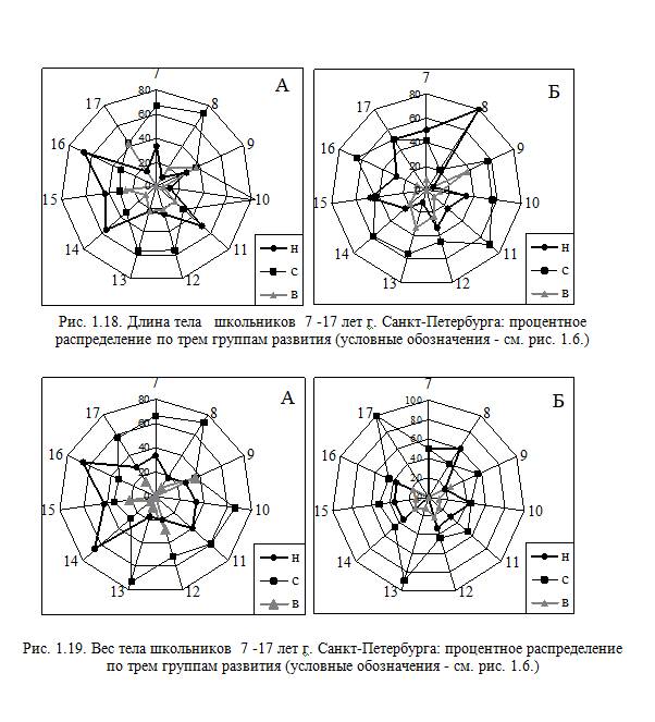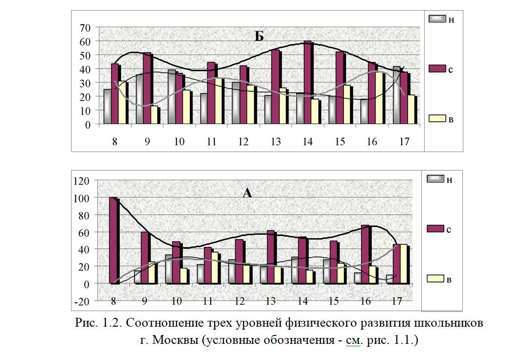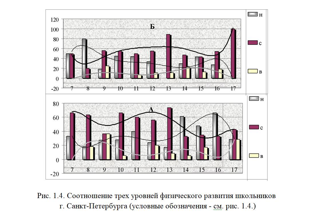 В г. Санкт-Петербург общий показатель ФП – результат суммации разнонаправленных вкладов отдельных двигательных качеств, поскольку, например, мальчики с 7 до 11 лет отличаются низким уровнем выносливости, высоким – силы и скоростно-силовых качеств, и средним – скорости. Увеличение доли высокого уровня ФП в среднем школьном возрасте у девочек также обусловлено выносливостью и скоростно-силовыми признаками.