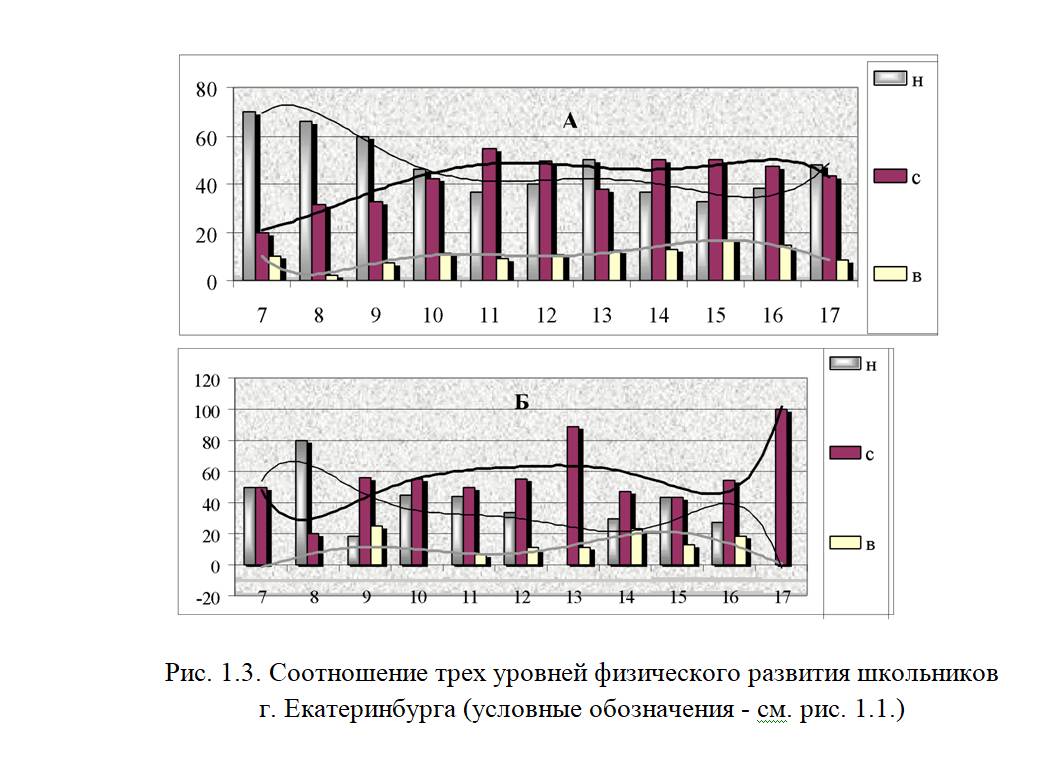 Низкий уровень ФП у екатеринбургских школьников обусловлен в основном недостаточным развитием силы, особенно у мальчиков, и, частично, от низких скоростных качеств у всех младших школьников и низких скоростно-силовых качеств у младших школьниц. В развитии выносливости средний уровень резко преобладает над остальными, а у мальчиков с 13 лет высокий уровень встречается чаще низкого.
