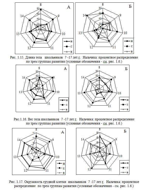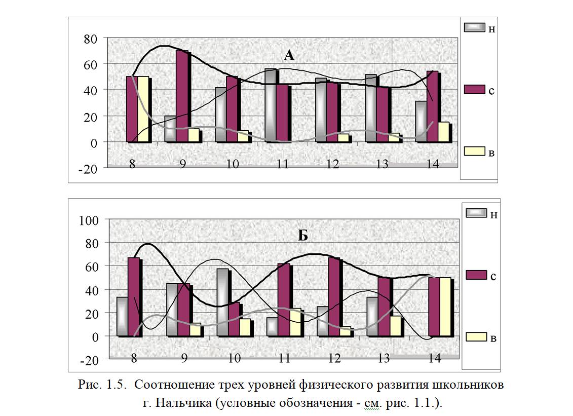 В г. Нальчик низкий уровень характерен для выносливости у мальчиков в 11-14 лет, у девочек – в 13-14 лет, а также для скорости у девочек 10-13 лет; высокий уровень преобладает в развитии силы почти во всех возрастах, как у мальчиков, так и у девочек. Для скоростно-силовых качеств у девочек с 8 до 12 лет, а у мальчиков – постоянно, хотя с 11 лет это преобладание над средним уровнем выражено незначительно.