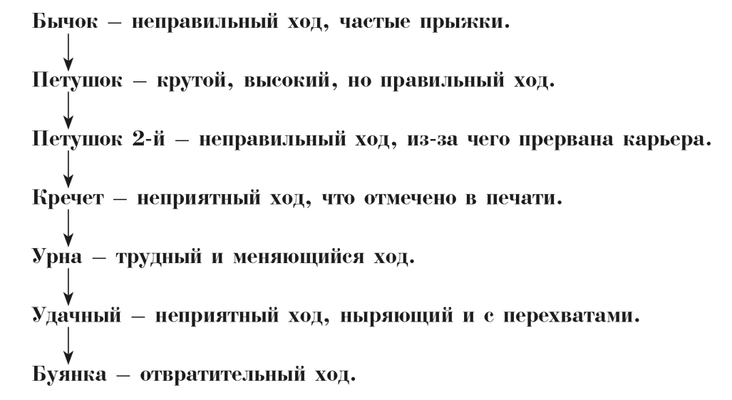 Если я посвящаю особую главу ходу Бычка и его потомков, то на это я имею весьма веские и серьезные основания. Казалось бы, совершенно достаточно и вполне уместно при обзоре призовой карьеры Бычка указать на то, какой ход имел этот жеребец. Что же касается его потомков, то едва ли есть возможность разобраться теперь в их ходах. Так вопрос должен был стоять, и так бы он стоял для всякого другого жеребца, но отнюдь не для Бычка. За самым редким исключением, все наши призовые знаменитости, а также их славные потомки имели превосходные, правильные хода, а потому, чтобы указать на них, потребовалась бы не отдельная глава, а лишь две-три строчки. Все обстоит иначе, когда приходится говорить о ходе самого Бычка и его потомков. Дело в том, что я намереваюсь доказать: и сам знаменитый Бычок, и большинство его резвейших потомков шли неправильными ходами, что, к сожалению, стало особенностью этой знаменитой линии. Это обвинение настолько серьезно, что не может быть брошено Бычкам голословно, а должно быть строго обосновано и доказано. Мне придется привести некоторый фактический материал в доказательство выдвинутого мною положения.