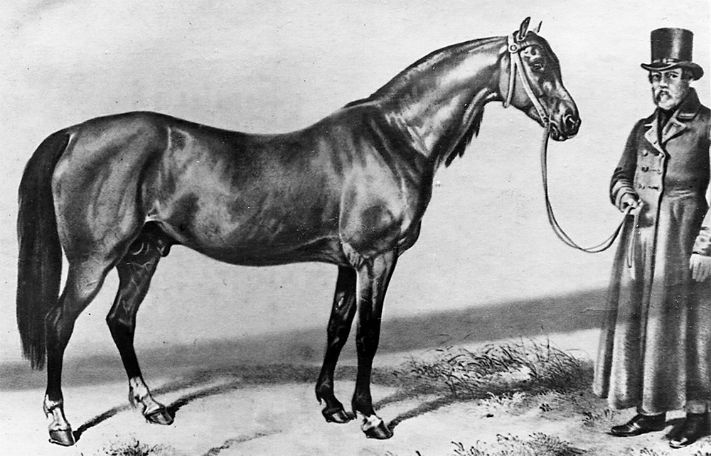 Перехожу теперь к описанию форм самого Бычка, а также его славнейших потомков. Начну с масти. Бычок был гнедой масти. В описи В.И. Шишкина он показан просто гнедым, в описи Д.П. Голохвастова – светло-гнедым, в «Журнале коннозаводства» за 1842 год (№ 3) он также показан светло-гнедым. Судя по превосходному портрету кисти Рауха, Бычок был светло-гнедой, причем его масть имела густой, сочный, красноватый тон. Свою характерную гнедую масть Бычок очень упорно передавал своим потомкам, вплоть до самых отдаленных. В его потомстве было также много рыжих и бурых лошадей. Серые встречались очень редко, а вороные – как исключение.