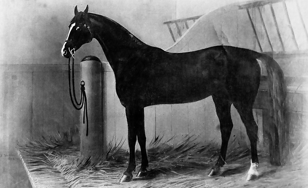 Благодаря портрету Рауха мы можем судить, какая грива и какой хвост были у Бычка. Грива у него лежала налево, что отмечено в описи Голохвастова и видно на портрете, и была длинная – грива упряжной лошади. Хвост Бычка сильный, обильный волосом, висит тяжелым снопом; он черный, равно как и грива, без каких-либо седых волос или коричневого отлива. Эту черту Бычок тоже упорно передавал потомству. В пример приведу двух рысаков Дубровского завода. Мне всегда очень нравился Быстролётный (сын коробьинской Залётной), грива которого ниспадала очень низко и была необыкновенно длинна. Знаменитый Хулиган также имел длинную гриву, ее принуждены были заплетать в косы.
