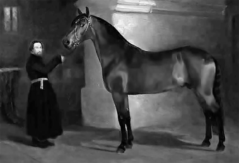 Портрет голохвастовского Петушка нигде не был напечатан. Но история коннозаводства обязана графу Воронцову-Дашкову тем, что портрет Петушка был написан известным художником Френцем. Я не люблю портреты Френца: это превосходный художник, но посредственный портретист, к тому же этот немец недостаточно проникался духом рысистой лошади, чтобы изобразить ее так одухотворенно, как это делал незабвенный Сверчков. Портрет Петушка кисти Френца по рисунку неинтересен, да и по живописи жидок и дрябловат. Мне удалось его разыскать после революции в Зимнем дворце: туда, в отдел фонда по делам музеев, были свезены многие предметы искусства из петербургских аристократических особняков. Попали туда и портреты лошадей графа Воронцова-Дашкова, ныне находящиеся в Прилепском музее. Все эти портреты безымянные, ни на одном нет имени изображенной лошади, что в значительной мере лишает их интереса. Когда я впервые их просматривал, я об этом глубоко сожалел. Каково же было мое удивление и радость, когда на одном из двадцати портретов все же оказалась надпись! Я ее прочел и пришел в восторг: «Петушок завода Голохвастова, род. 1842 г., от Бычка и Важной». Я хорошо знаю почерк графа Воронцова-Дашкова и могу засвидетельствовать, что эта надпись сделана им. Граф как бы предвидел, что настанет время, когда лошадей, изображенных на этих портретах, никто не будет знать, и, желая, чтобы изображение знаменитого Петушка не затерялось и дошло до будущих времен, собственноручно сделал на портрете надпись. Отчасти это может служить доказательством того, какое громадное значение придавал Воронцов-Дашков Петушку.