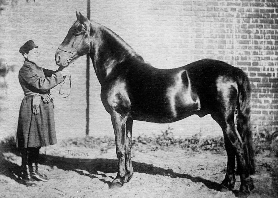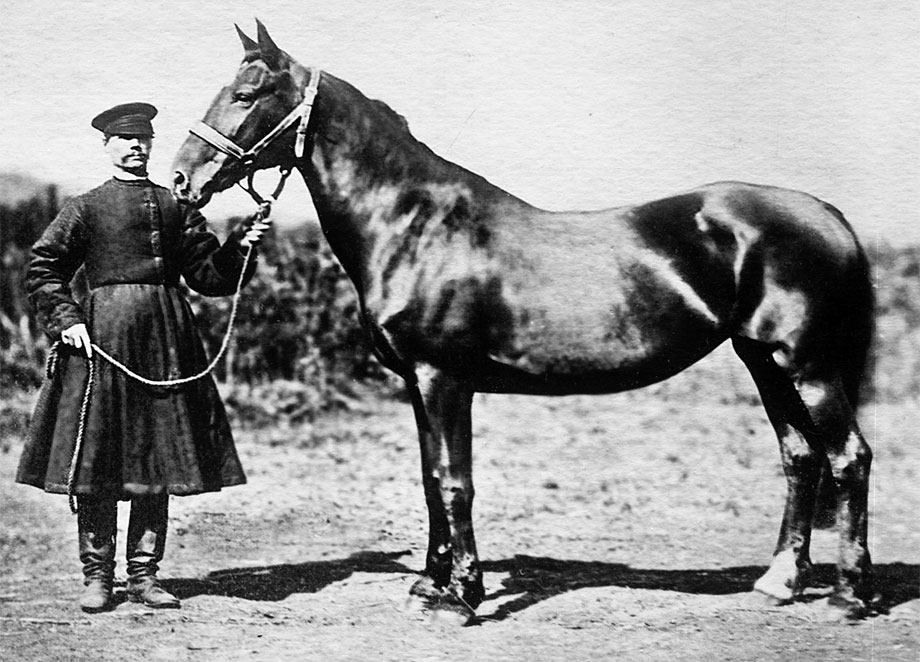 Перейдем теперь к описанию форм Бычка. Из очевидцев, знавших эту лошадь, оставил свое описание один Коптев: «Несколько длинные бабки и довольно тонкие берцовые кости передних ног, стройная, длинная шея с прекрасным зарезом намекали на влияние английской крови». Затем, описывая формы Петушка, Коптев сравнивает его с Бычком: «Петушок похож на своего славного отца: он несколько меньше его ростом, имеет также маленькую седловатость в спине… Те же сухие ноги и длина крутореброго стана. Но у Петушка ширина груди и зада более соразмерны, чем у Бычка, у которого зад был несравненно шире груди». Здесь мы имеем наиболее характерные признаки экстерьера Бычка, которые, особенно мягкость спины, почти обязательны для громадного большинства его потомков.