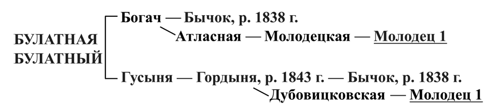 Таким образом, Булатная и Булатный имели закрепленные имена Бычка и Молодца 1-го и являлись типичными Бычками. Создание их должно быть записано в величайший плюс основному Бычку. Удивительно, как лица, писавшие о Бычке, обходили молчанием Булатного и Булатную. Это, вероятно, происходило потому, что Бычок считался завода Рогова, а не Смесова и его не причисляли к потомству Бычков или же сомневались в этом. А вместе с тем появление именно в семье Бычков такой великой кобылы, каковой была Булатная, и такого производителя, каким был ее брат Булатный, в высокой мере реабилитирует заводскую работу первых годов основного Бычка.