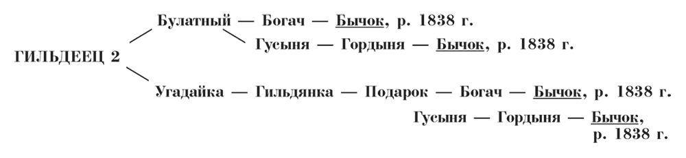 Бычок дал много превосходного приплода. Первыня, дочь Гордыни, также насчитывает в своем потомстве классных рысаков. Классный жеребец Ратный редко приводился в пример лицами, писавшими о генеалогии, а между тем он был родным братом Булатного и Булатной, блестяще бежал и принадлежал в конце 1850-х – начале 1860-х годов известному охотнику Мясникову. Распространяться о заводской деятельности Булатного и Булатной не приходится: о ней есть превосходная в статистическом отношении работа Красовского. Одним из лучших сыновей Булатного по резвости и заводской карьере был Гильдеец 2-й, в чью родословную введена еще одна струя той же крови.