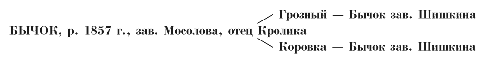 Из приведенных данных совершенно ясно, что мосоловский Бычок был именно сыном Грозного. К породе мосоловского Бычка имеется примечание, где сказано: «Мать Бычка – Коровка зав. Д.Д. Голохвастова от Бычка зав. В.И. Шишкина и Касатки Хр. зав. Из представленного г-ном Мосоловым подлинного аттестата Коровки, подписанного г-ном Голохвастовым, видно, что она приобретена у г-на Голохвастова в 1855 г. слученною с Хвальным». Те, кто редактировал пятый том, не обратили должного внимания, что Бычок мосоловский родился в 1857 году, а его мать Коровка была куплена у Голохвастова в 1855 году слученной с Хвальным. Стало быть, Бычок мог родиться в 1856-м, а никак не в 1857 году. На это и обратил внимание Прохоров. А Храповицкий воспользовался примечанием Прохорова.