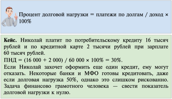 Чтобы сохранять финансовую стабильность, контролируйте размер долговой нагрузки. Приемлемый уровень – когда на погашение обязательств уходит максимум треть доходов.