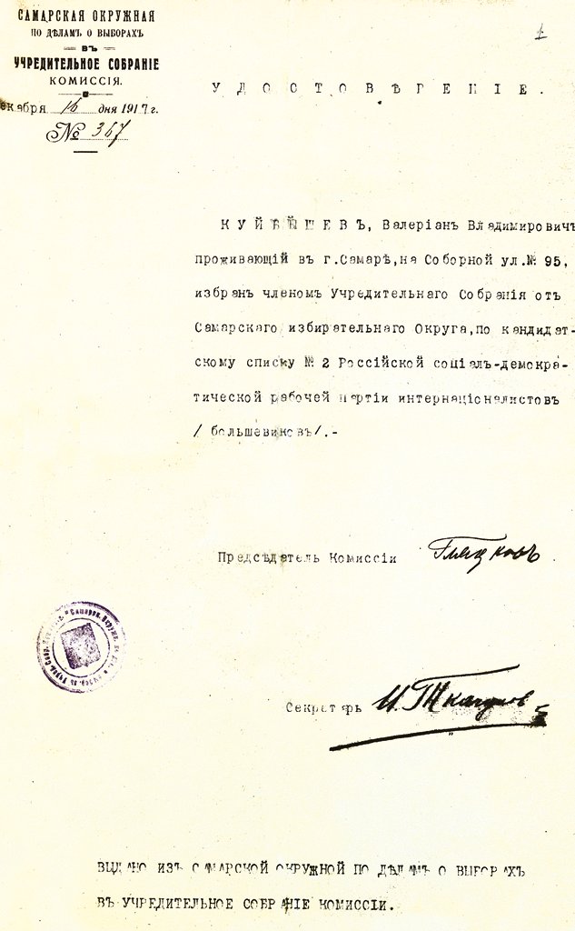 Удостоверение В.В. Куйбышева об избрании депутатом Учредительного собрания