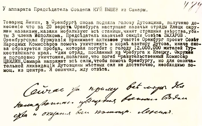 – Товарищ Ленин, в Оренбурге снова подняла голову дутовщина; получено донесение, что за 20 верст от Оренбурга наступают казачьи отряды. Илецк окружен казаками, казаки мобилизуют все станицы, чинят страшные зверства, убиты три члена исполкома, председатель казачьей секции совета [Н.П.] Захаров[32]. Оренбургская буржуазия принимает активное участие. Оренбург просит Совет Народных Комиссаров помочь уничтожить в корне авантюру Дутова, иначе снова образуется пробка, которая погубит с голоду 12 000 000 жителей Туркестанского края. Один отряд, посланный из Оренбурга к Илецку, окружен и поголовно уничтожен; полагают, что погиб правительственный комиссар [С.М.] Цвиллинг. Самара напряжет все силы, чтобы помочь Оренбургу, но для окончательной ликвидации дутовщины местных сил недостаточно, необходима помощь из центра. Я окончил, жду ответа.