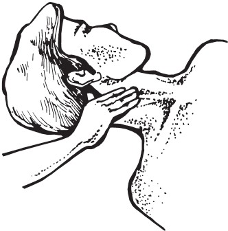 Это грудинно-ключично-сосцевидная мышца, второй наш ориентир. Найдя оба образования, можно приступать к измерению. Пальцы, от указательного до мизинца, выстраивают в линию между трахеей и мышцей, на уровне щитовидного хряща. Их располагают по ходу артерии, т. е. параллельно шее. Если все выполнено верно, человек может четко ощутить пульс (рис. 10).