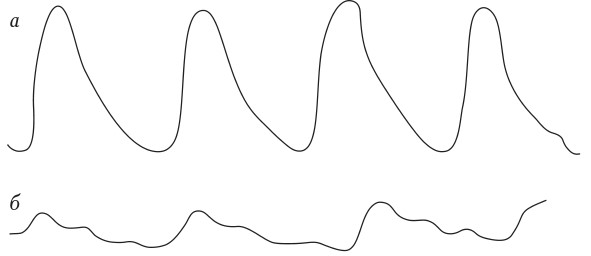 Рисунок 13. Сфигмограмма: а – при скором пульсе, б – при медленном пульсе