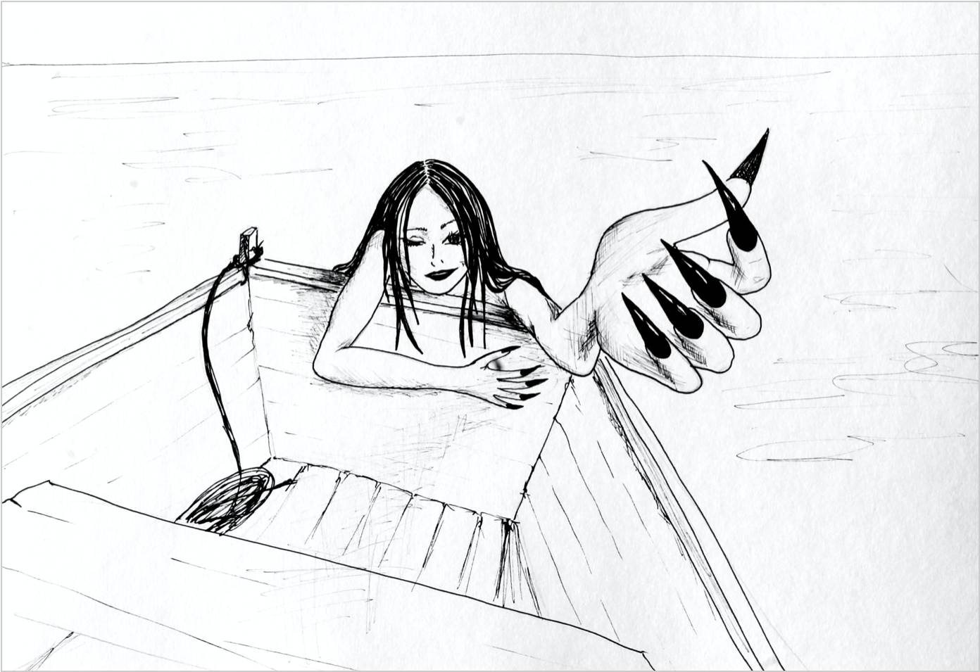 Русалка висела на борту, зацепившись за него локтем левой руки, а правую призывно тянула к рыбаку: