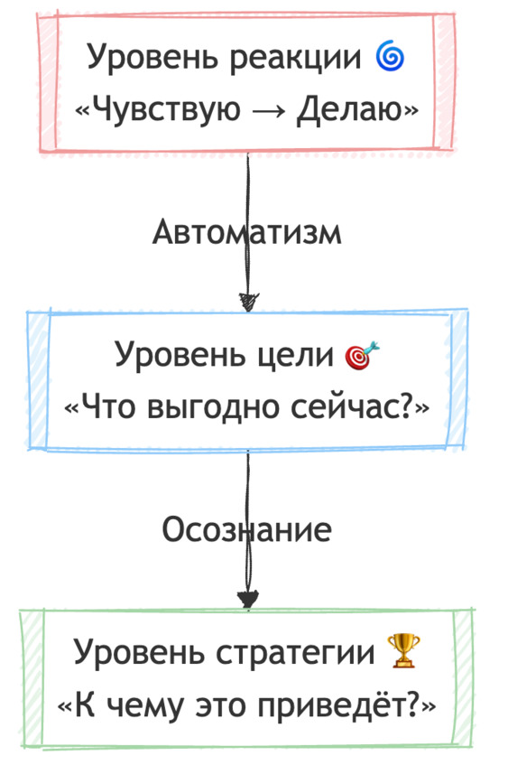 Уровень реакции. Это поведение по привычке. Быстро, автоматично, на уровне «чувствую → делаю». Примеры: покупка еды на эмоциях, соглашение на невыгодные условия «чтобы не спорить».