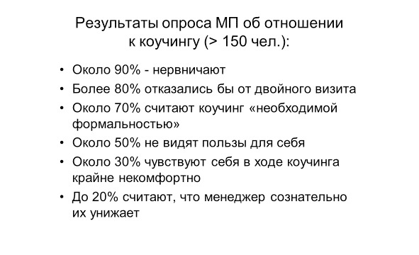 Думаю, что примерно такая же картина может иметь место в настоящее время и в других компаниях. На мой взгляд, основная причина такого положения дел заключается в низкой эффективности полевого коучинга.
