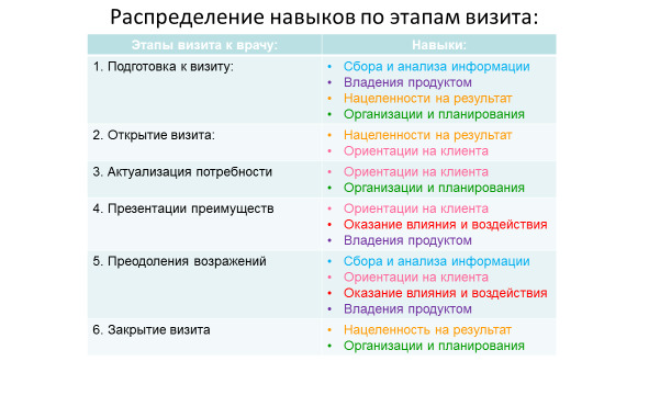 • понимать связь профессиональных компетенций с поведением медицинского представителя на визите к врачу;
