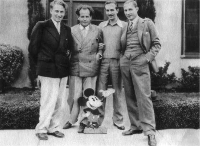 Слева направо: Г. Александров, С. Эйзенштейн, У. Дисней и Э. Тиссэ в Голливуде. У ног Уолта – его всемирно известный Микки Маус