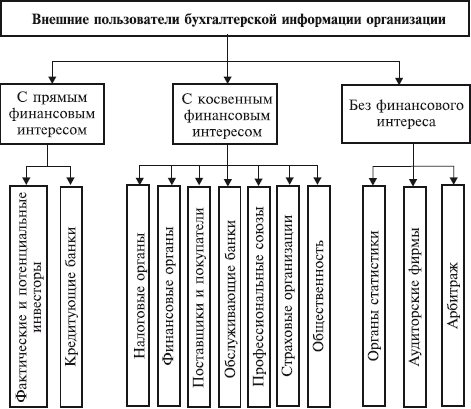Внешних пользователей бухгалтерской информации можно разделить на три группы: с прямым финансовым интересом, косвенным финансовым интересом и без финансового интереса (рис. 1.2).[2] Они используют информацию отчетного характера и, как правило, не применяют моделирование бизнес-процессов (в отличие от внутренних пользователей), а оценивают в целом эффективность работы организаций.