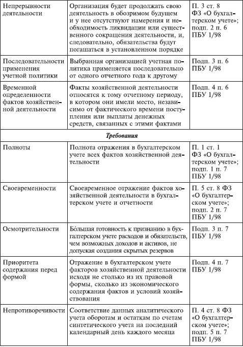 Отечественные учетные принципы (см. табл. 1.1), называемые требованиями и допущениями, закреплены законодательно в Федеральном законе «О бухгалтерском учете» и ПБУ 1/98 «Учетная политика организации», утвержденном приказом Минфина России от 9 декабря 1998 г. № 60н.