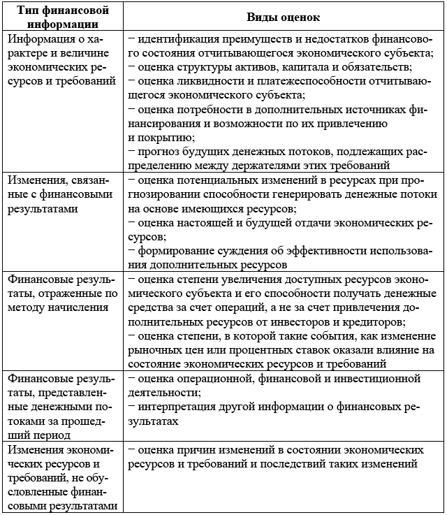 Информация, содержащаяся в финансовой отчетности, об имеющихся у экономического субъекта ресурсах и требованиях, и изменениях в их состоянии позволяет заинтересованным в деятельности экономического субъекта лицам сформировать как минимум два типа общих оценок:
