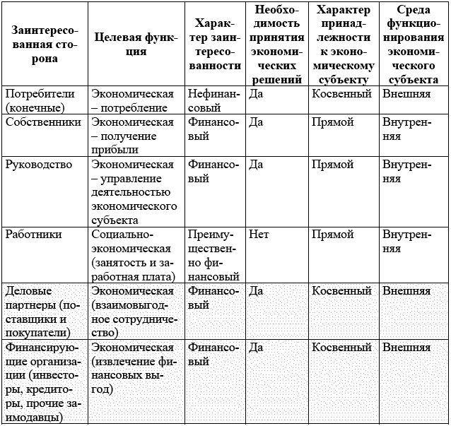 П. Характер и степень заинтересованности перечисленных субъектов в деятельности экономического субъекта определяется их целевой функцией, в соответствии с которой как во внешней, так и во внутренней среде функционирования экономического субъекта можно выделить две группы заинтересованных сторон: