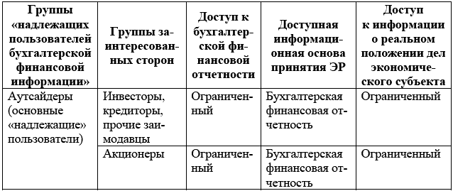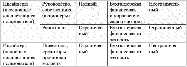 Основываясь на различиях между отдельными группами «потребителей» и «надлежащими пользователями бухгалтерской финансовой информации» в правах доступа к бухгалтерской финансовой информации в степени риска, характеризующего степень неопределенности ситуации при принятии экономических решений, а также в степени ограниченности доступа к информации о действительном состоянии дел экономического субъекта, можно выделить следующие критерии отнесения тех или иных субъектов к аутсайдерам или инсайдерам: