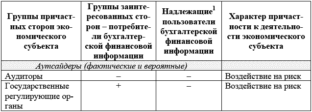 Группы аутсайдеров и инсайдеров следует различать не только среди «надлежащих пользователей бухгалтерской финансовой информации», но и на уровне заинтересованных сторон экономического субъекта – «потребителей бухгалтерской финансовой информации», а также причастных к функционирующему экономическому субъекту сторон (табл. 7).