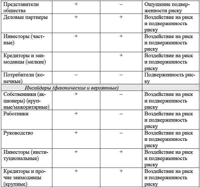 1) инсайдеры – обладают полной информацией о реальном положении экономического субъекта, низким уровнем финансовых рисков, возможностью влияния на деятельность и политику экономического субъекта;