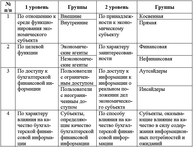 Классификация потребностей и ожиданий заинтересованных сторон, оказывающих влияние на качество бухгалтерской финансовой информации. Следующим вопросом является идентификация потребностей и ожиданий заинтересованных сторон экономического субъекта с целью установления требований, предъявляемых к качеству бухгалтерской финансовой информации. Потребности представляют запросы людей, определяющие потребительскую стоимость продукции (услуги). Для целей нашего исследования в соответствии с произведенной классификацией заинтересованных сторон следует различать два уровня потребностей субъектов, заинтересованных в деятельности экономического субъекта.
