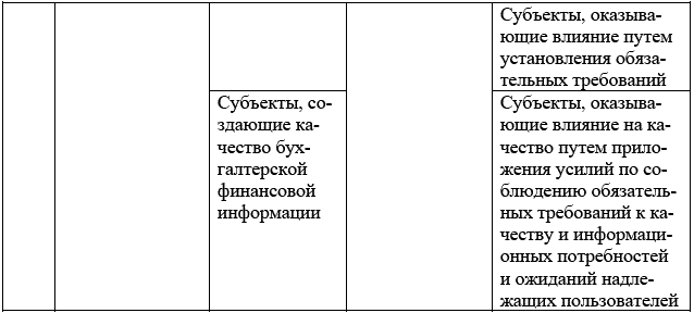 2) субъекты, оказывающие влияние на качество путем установления обязательных требований, – это социально-правовые агенты, действующие в сфере регулирования бухгалтерского учета и отчетности в интересах надлежащих пользователей бухгалтерской финансовой информации. К ним относятся государственные регулирующие органы в сфере регулирования бухгалтерского учета и отчетности, и профессиональное бухгалтерское сообщество;