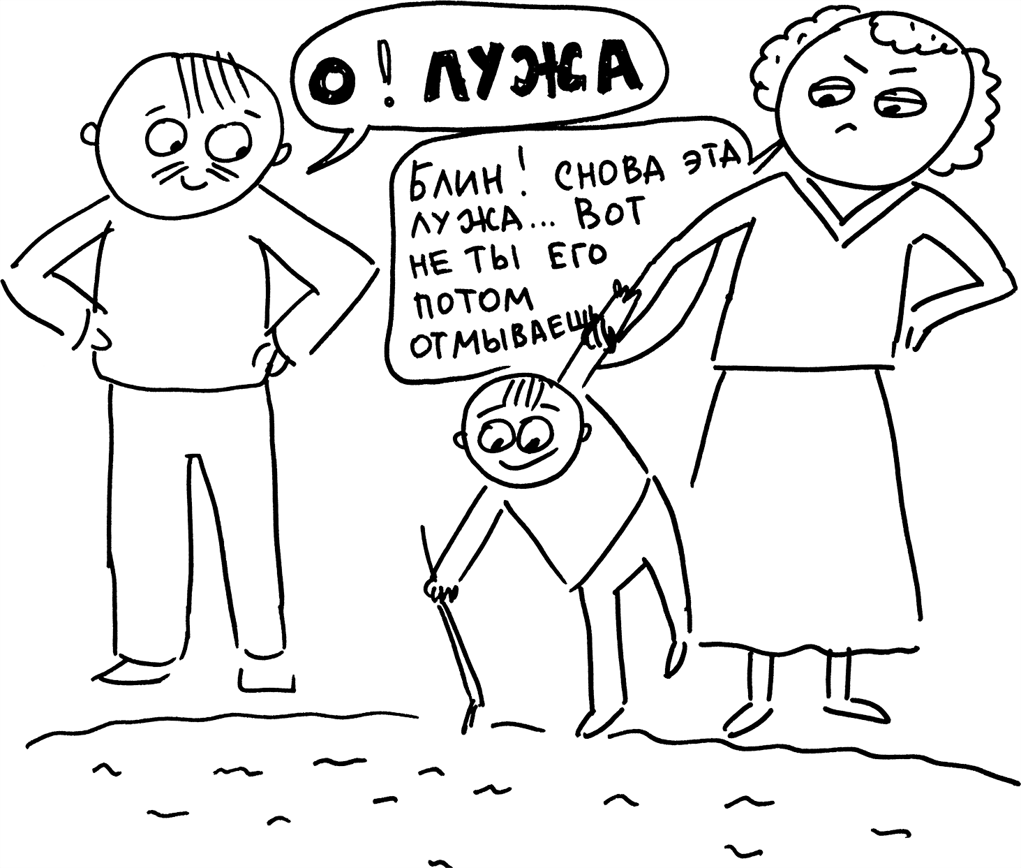 А могло бы быть и по-другому: «Ой, не надо! Не лезь в лужу!» (Есть у меня гипотеза, что, если не наиграться с лужами в два года, ребенок все равно наверстает недополученный опыт позже, лет, скажем, в десять. То есть в десять лет ему будет не до учебников, если важный опыт взаимодействия с лужами он упустит.)