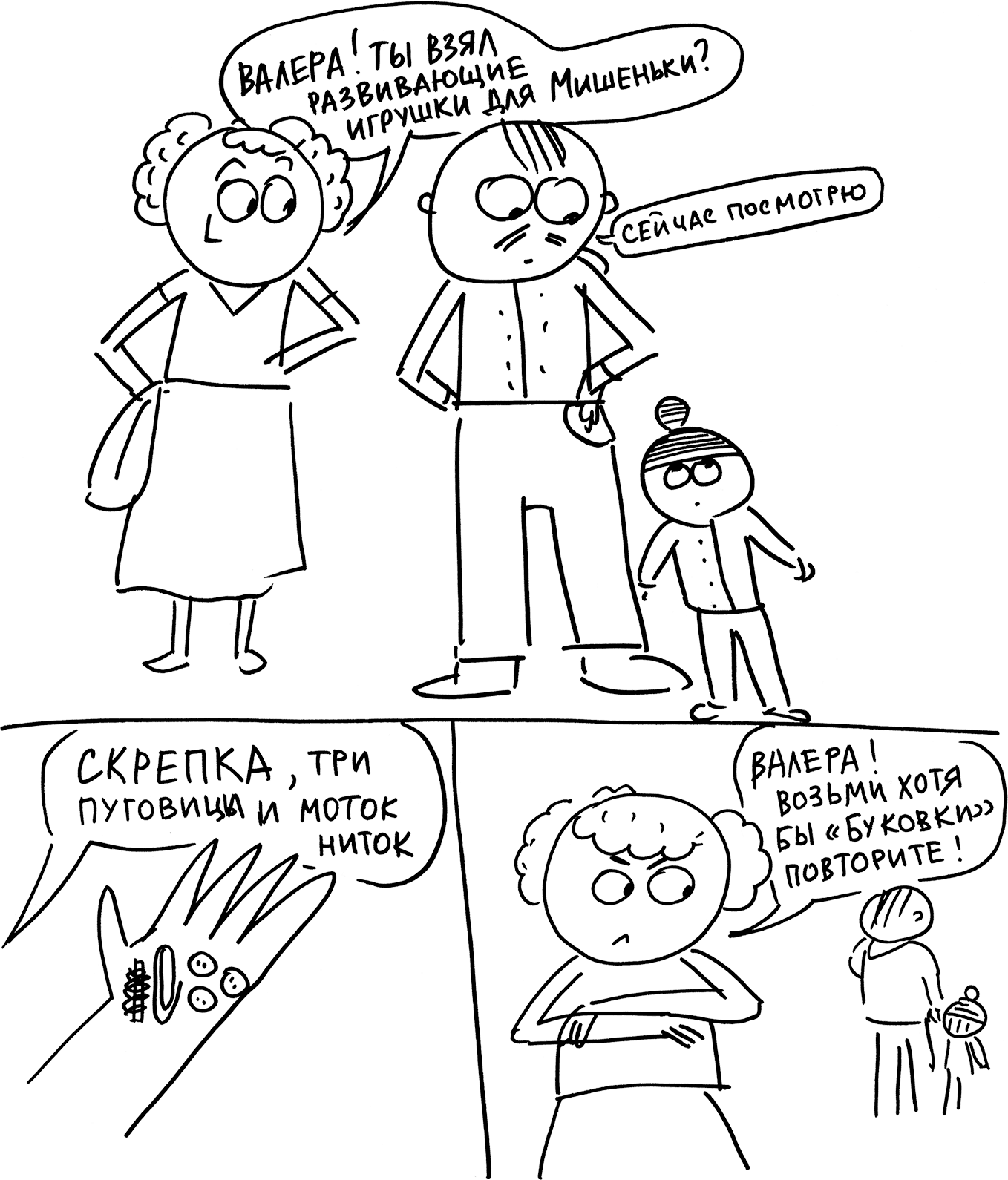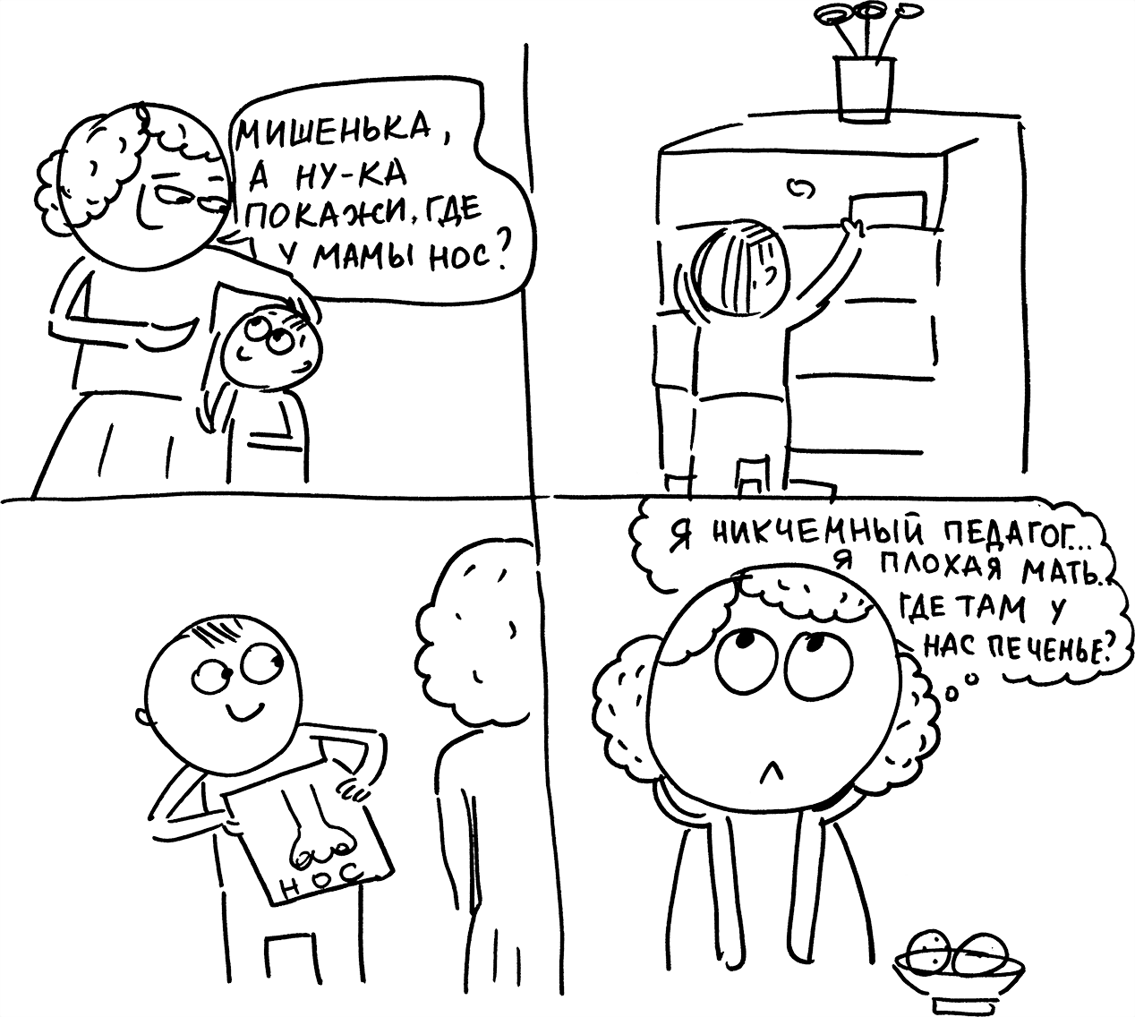 Через чувственный опыт, опираясь на зрение и осязание, он должен находить сходства и отличия. «У мамы тоже есть нос. Но он больше, чем у меня. А папин нос больше, чем у мамы. А еще у папы есть уши. Если сильно потянуть папу за уши, папа закричит, что ему больно. А если закрыть свои уши руками, что-то случится с маминым голосом» – вот это и есть познание мира, вот это и имеет отношение к развитию, это бесценный опыт, и притом бесплатный.