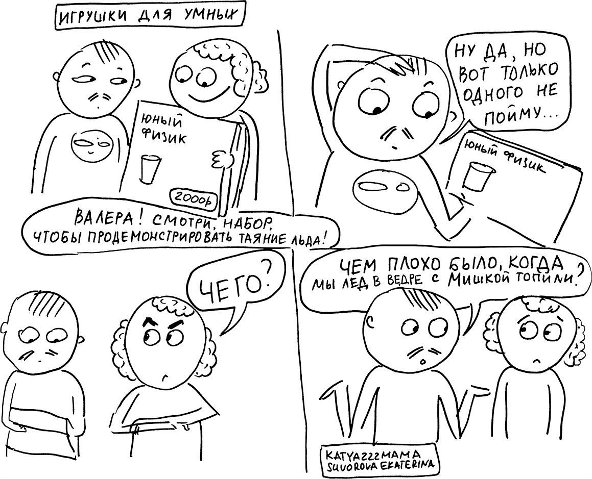* * *Развивающий потенциал игрушки напрямую зависит от развивающего потенциала взрослого, в руки которого эта игрушка попадает. А от чего зависит развивающий потенциал взрослого? От наличия у него творческого мышления, умения найти нужную информацию, от базовых знаний вообще и базовых знаний по психологии развития в частности. Всё. Этого достаточно. Ценность различных школ раннего развития я вижу только в том, чтобы помогать взрослым развивать этот потенциал у себя. Посыл правильной школы, наверное, должен быть таким: «Смотрите, развивать ребенка – это просто. У вас тоже получится. Попробуйте сами. Вы можете что-то подобное придумать и сделать дома».