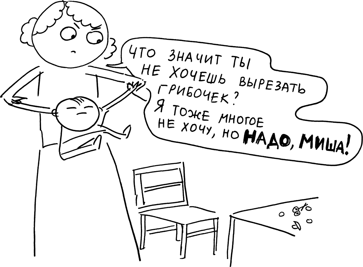 «А что мы покажем папе?» – обреченно подумала я и тут же позвонила ему в расстроенных чувствах. Я сказала, что его сын не захотел лепить грибочек, как все остальные дети, увы и ах. Но из моего рассказа он вынес совсем другое. Он радовался: «Мой сын слепил машинку!»