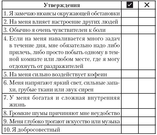 Вы открыли эту книгу, но всё ещё не уверены являетесь ли человеком с высокой чувствительностью? Тогда перед прочтением предлагаю пройти небольшой тест от Элейн Эйрон – американского психотерапевта, клинического психолога и исследователя темы высокой чувствительности.
