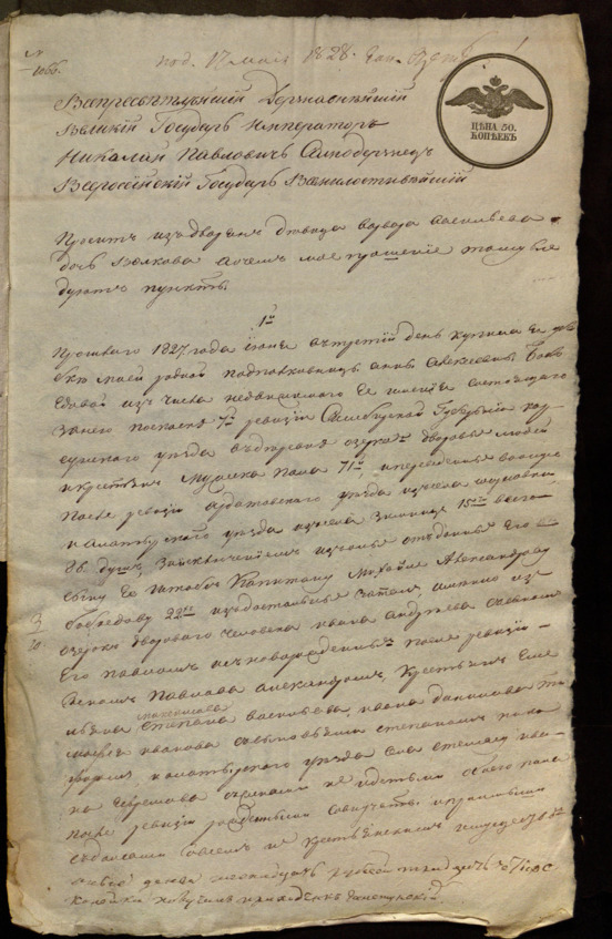 Прошение императору Николаю Павловичу от девицы из дворян Варвары Васильевой дочери Волковой.