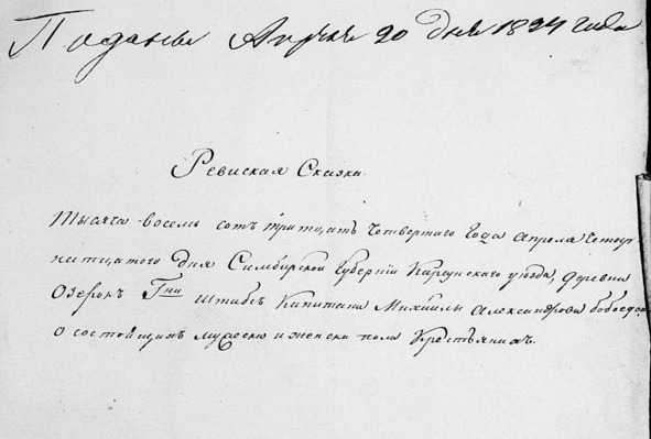 Ниже я познакомлю вас с данными Ревизской Сказки Тысяча восемь сот тридцать четвертого года апреля четырнадцатого дня Симбирской губернии Карсунского уезда, деревня Озерок Гна Штапс Капитана Михайлы Александрова Бобоедова о состоящих мужского и женского пола Крестьянах.