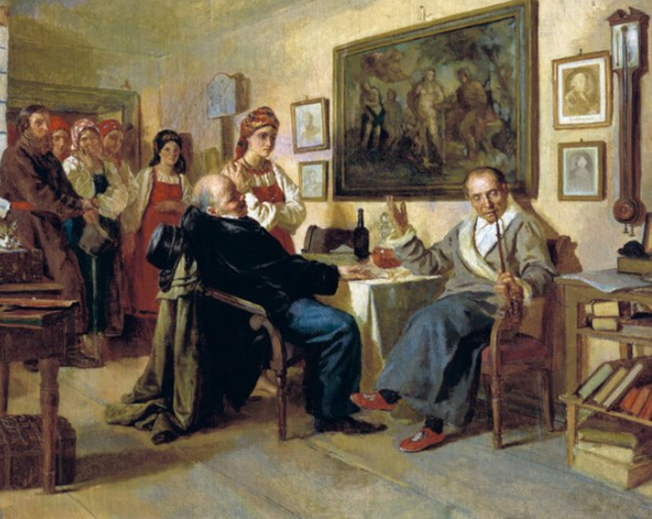 Один помещик продает другому крепостную девицу, показывает покупателю пять пальцев – 500 рублей – средняя цена русского крепостного в первой половине XIX века. Крестьянка покорно ждет своей участи, другие крестьяне столпились в дверях и смотрят, чем закончится торг.