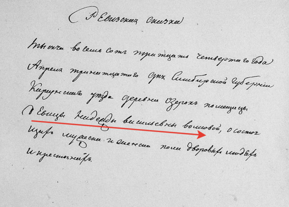 Жили в деревне Озерки в Тысяча восемьсот тридцать четвертом году Апреля тринадцатого дня Симбирской губернии Карсунского уезда деревни Озерок помещицы девицы Надежды Васильевны Волковой дворовые люди и крестьяне: